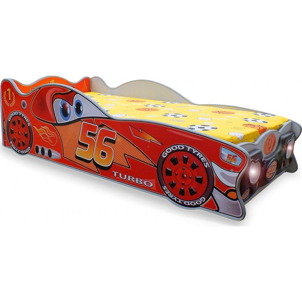 Barnsäng i form av en racerbil. Tillverkad av trä med madrass av polyester och bomull. LED-belysning i frontljusen.