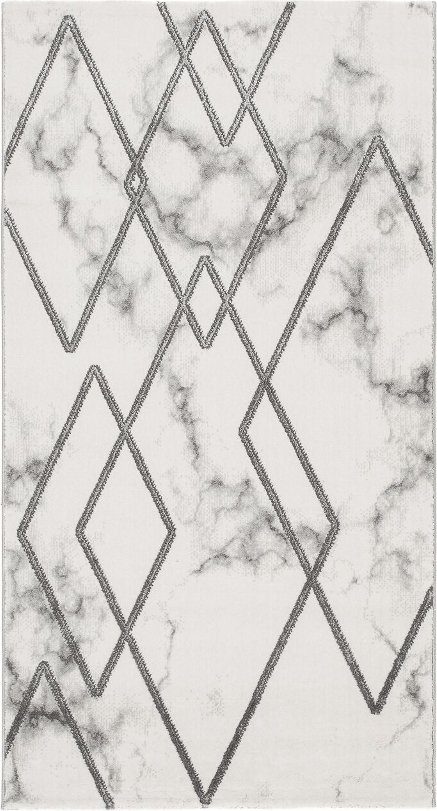 Mattans mönster för tankarna till marmor då den skiftar i olika vit/grå toner, samt att den har mörkare partier som ger mattan ett djup. Mattans mönster är tillverkat i Polyester vilket ger ett härligt lyster när ljuset faller på.