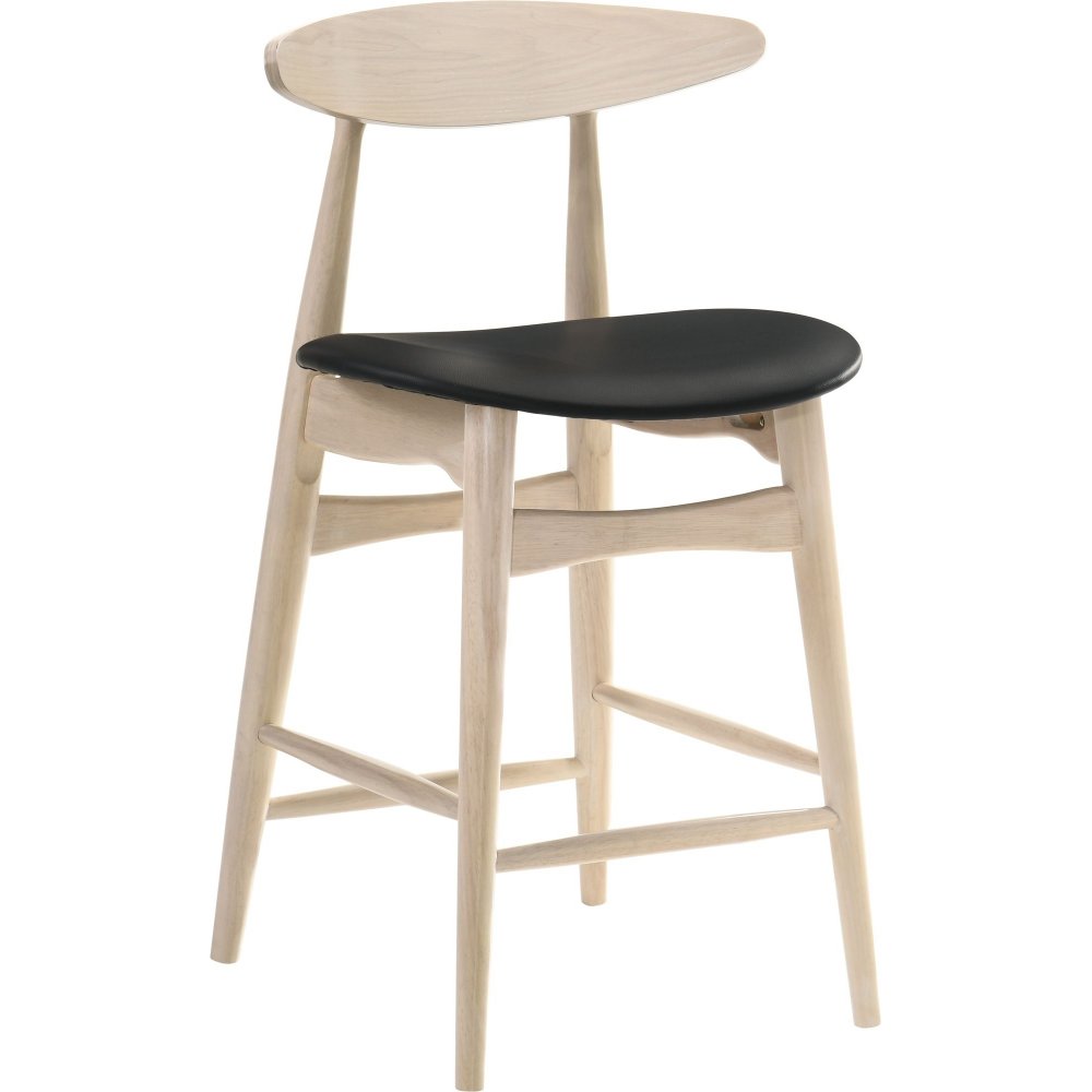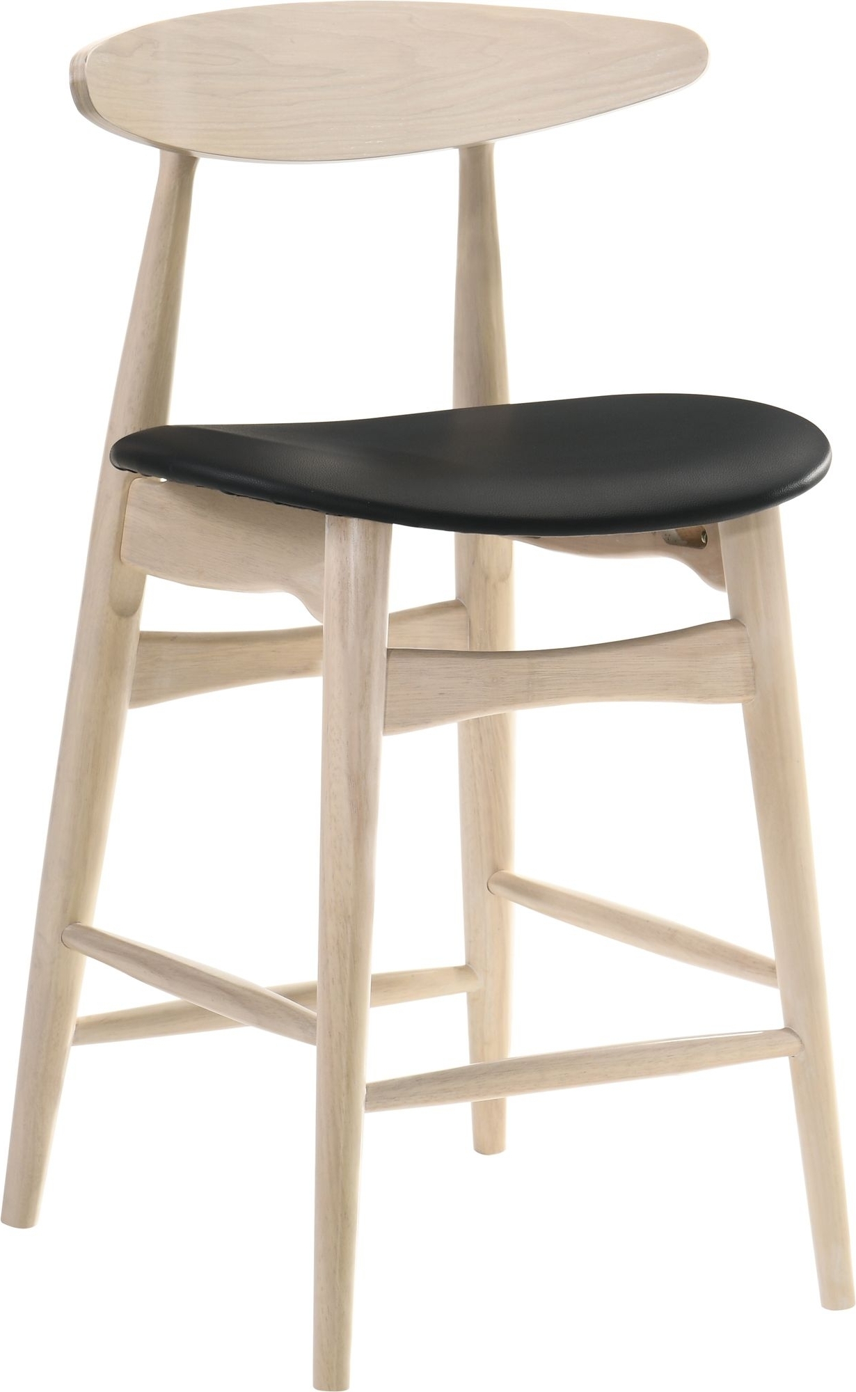 En komplett matgrupp i barhöjd bestående av ett fyrkantigt barbord och fyra barstolar. Bordet har ett underrede i whitewash och en svart toppskiva. Barstolarna är tillverkade i samma stil med underrede i whitewash och en sits i svart PU. Stolarna har ett svängt ryggstöd för ökad sittkomfort.