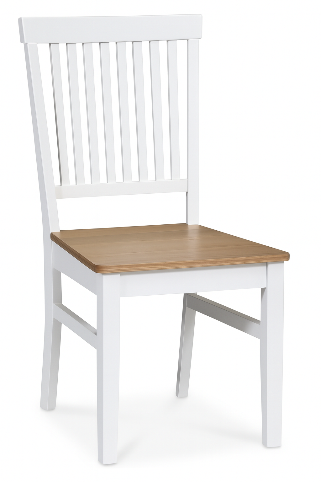 Klassiskt matgrupp, bord med underrede och toppskiva av massivt vitlackat trä. Modern stol i massivt heveaträ, vitlackad med sits av ekfanèr.