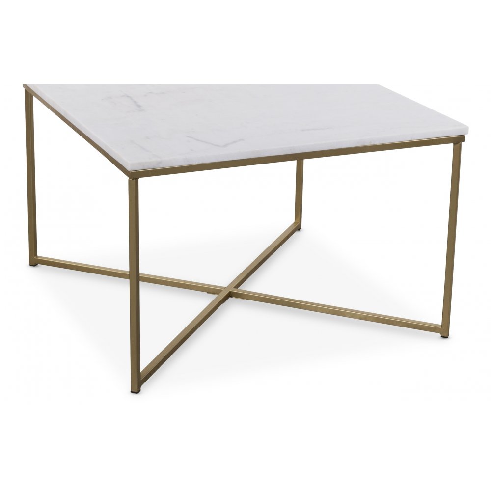 Elegant fyrkantigt soffbord med toppskiva i äkta vit marmor! Det stilrena Underredet är lackat i matt mässing och format som ett kryss!