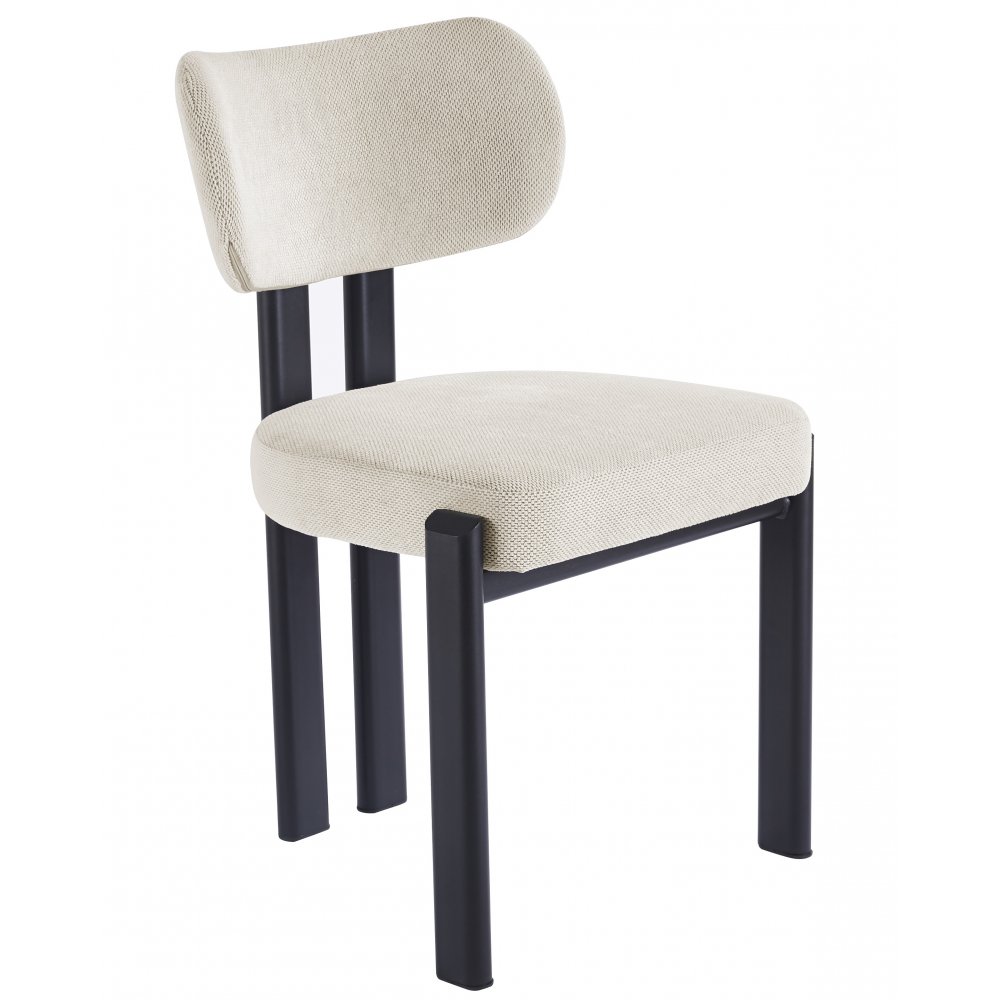 Till bordet ingår åtta Callum matstolar med mjukt stoppad sits och rygg klädda i ett beige tyg som skapar en varm och harmonisk känsla. De svartlackerade metallbenen ger en elegant kontrast till den ljusa klädseln och bidrar till ett modernt, balanserat uttryck. Callum är lika bekväm som den är stilren – en stol som fungerar utmärkt till både runda och rektangulära bord.