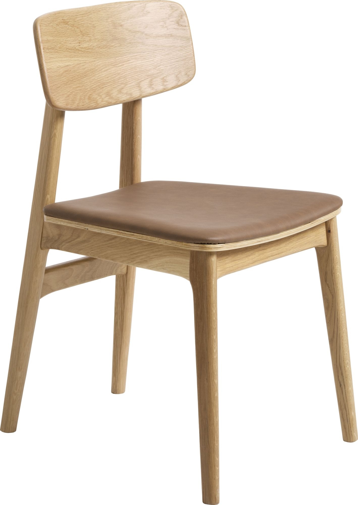 Kleppen stolar kombinerar hållbar ekstomme med en mjuk, brun sits i PU som är både bekväm och lätt att rengöra. Den ergonomiskt formade ryggen ger bra stöd, och den oljade finishen matchar bordet för en enhetlig och elegant matplats.