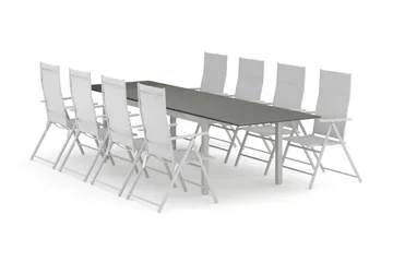 Tunis utomhus matgrupp förlängningsbart 205/305x90 cm med 8 Monaco Light positionsstolar, Vit/Grå
