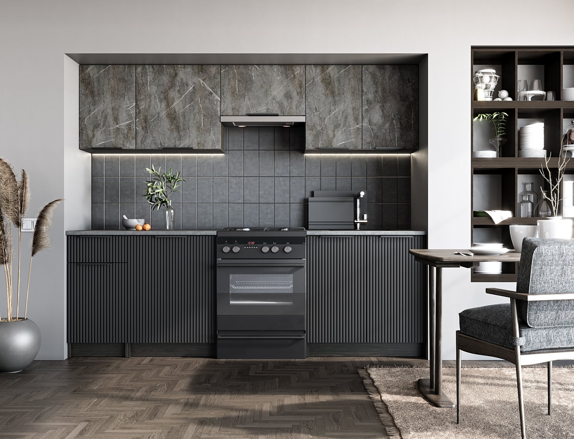 Tamara komplett kök 240 cm - Grå marmor/svart/grå
