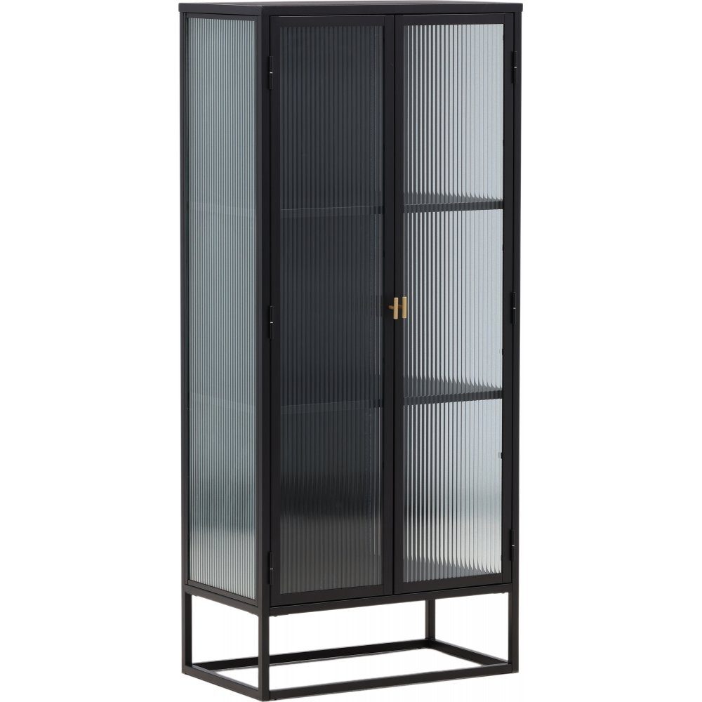 Stilrent och smart - allt man kan önska. Vårt omtyckta skåp Garis gör verkligen ett elegant intryck i vardagsrummet. Designen är iögonfallande med två höga glasdörrar i veckad design och en ram i svart pulverlackerat stål, det här skåpet står sig över tid. Dörrarna har mässingfärgade handtag vilket blir en snygg detalj. Hela skåpet vilar på en öppen ram i svart pulverlackerad stål som ger en luftig känsla och underlättar också för dammsugaren. Här får du en praktisk möbel som passar utmärkt för att förvara porslin eller annat som behöver lite extra utrymme - Inred ditt hem i en trendsäker känsla.